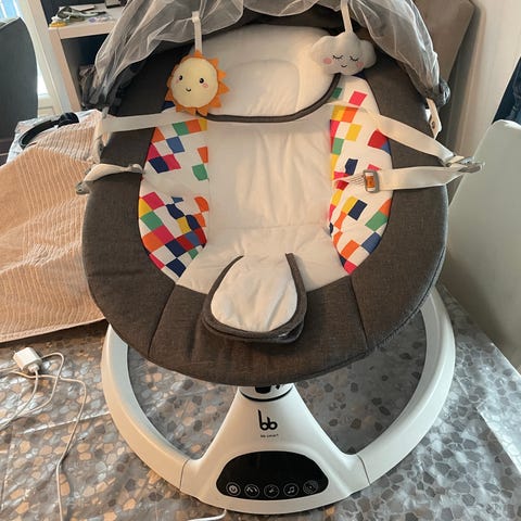 Vippestolen har rund base med elektronisk styring i fronten og flere knapper for ulike funksjoner. Setet har integrert sele for å holde barnet på plass. Overdelen har kalesje med myggnett som kan trekkes ned over barnet. Egnet som hvile- og vippestol for baby i hjemmet. Strømledning følger med for tilkobling til stikkontakt.