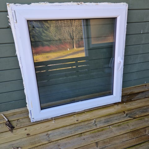 Vindusramme med to glassfelt i hvit utførelse. Rammen har en fast midtstolpe.