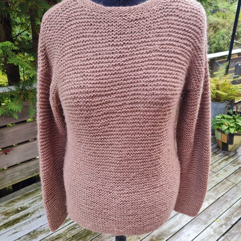 Grovstrikket lys lilla genser fra Mari Philippe, størrelse L. 68% bomull og 32% nylon. Brystvidde 104 cm og lengde 58 cm.