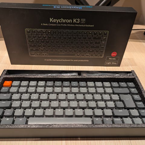 Keychron K2 Pro trådløst mekanisk tastatur med hot‑swappable mekaniske brytere og RGB bakgrunnsbelysning. Modellen på bildene har brun tactile Keychron K Pro-bryter. Tastaturet har kompakt layout, aluminiumskonstruksjon og støtte for tilkobling til opptil tre enheter. Det har innebygd oppladbart batteri og flere lysmoduser for bakgrunnsbelysning. Egnet som tilleggsutstyr til datamaskin for både jobb og fritidsbruk.