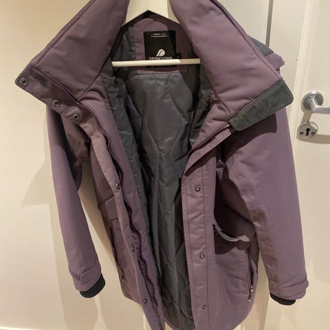 Didriksons regnjakke i størrelse 44. Jakken er hvit med diskret lilla mønster. Modellen har hette og hel glidelås foran. Svært lite og pent brukt. Fremstår som ny.