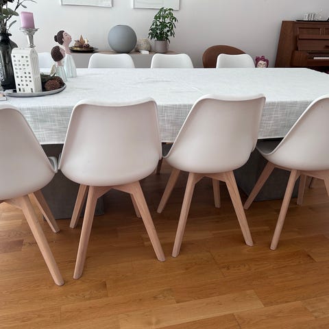 Spisestolene har god sittekonfort. De er pent brukt men den ene har par små merker på toppen, se bilde. Selges 500kr per stk