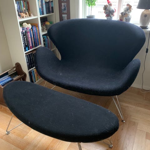 Fritz Hansen lenestol designet av Aage Petersen. Lenestolen har høy rygg og brede, buede armlener. Den er trukket i et lyst tekstiltrekk og står på hjul foran for enklere forflytning. Egner seg som sittemøbel i stue, lesehjørne eller TV-krok.Må selge den pga flytting.