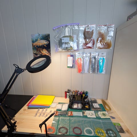Anvendelig lampe med mobilholder,forstørrelsesglass og oppbevaringsbrett.