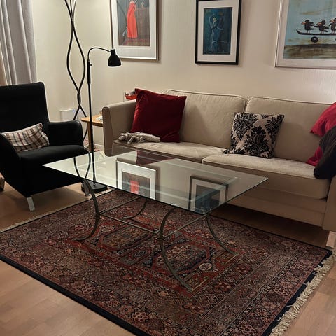 Lekkert salongbord med tykk glassplate og ståll understell i minimalistisk design. Glassplaten er usynlig festet og har et svevende uttrykk. Enkelte riper, for øvrig pent brukt. Selges derfor rimelig kr 1250 grunnet ommøblering.