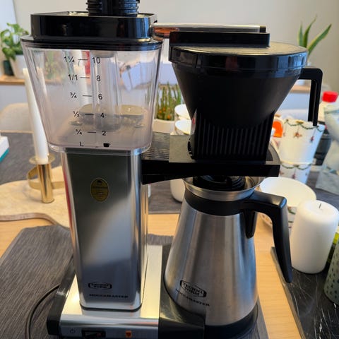 Moccamaster kaffetrakter i hvit utførelse med patina.