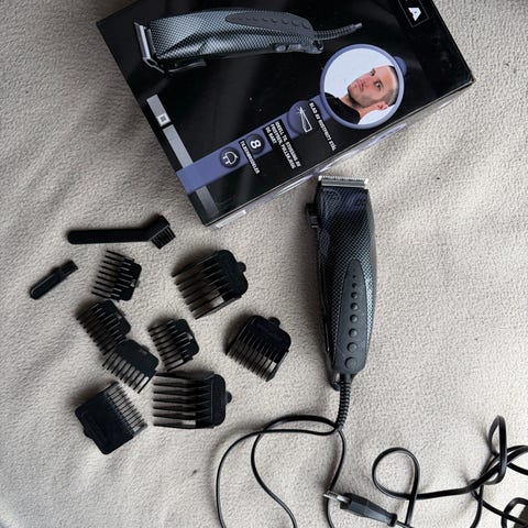 Hårklipperen leveres med flere kammer for ulike klippelengder, samt olje til vedlikehold av bladene. Ledning gir kontinuerlig drift uten behov for lading. Egnet til klipp og trimming av hår og skjegg hjemme.