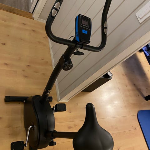 Trimsykkel med treningscomputer i oransje og hvit farge. Sykkelen har justerbart sete, pedaler med fotstropper og styre med håndtak. På styret sitter en enkel treningscomputer med display som viser grunnleggende treningsdata. Motstanden kan justeres med dreiehjul under displayet. Egnet til innendørs kondisjonstrening hjemme.