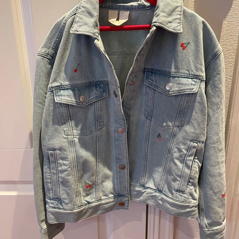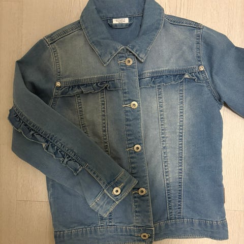 Olajakke i denim for jente i størrelse 140. Jakken er blå med slitteffekter og dekorative detaljer. Den har rund hals og knappelukking foran. Langermet modell med flere pyntelommer foran. Perle- og blondedetaljer langs hals og knappestolpe, samt liten «LOVELY»-tekst som dekor. Egnet som lett jakke eller som et ekstra lag over annet tøy. Det står størrelsen 12 på jakka, men den er liten i størrelsen.