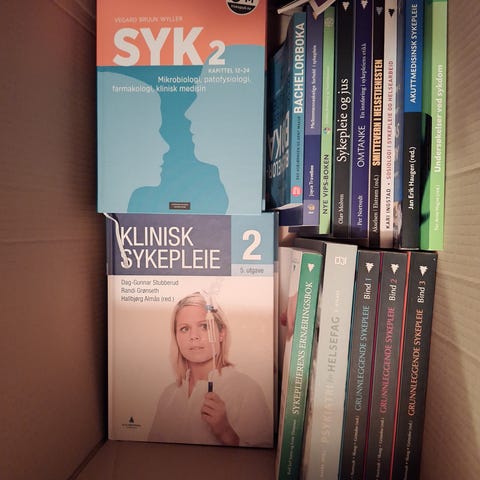 Diverse fagbøker til sykepleiestudiet. Brukte også flere av disse til videreutdanning i kreftsykepleie.