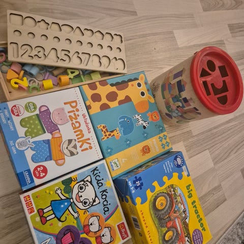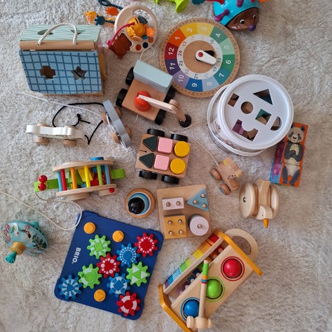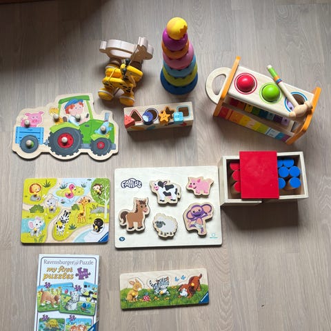 Selger en stor pakke med pedagogiske treleker for småbarn og førskolebarn.