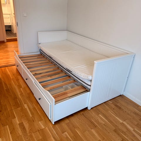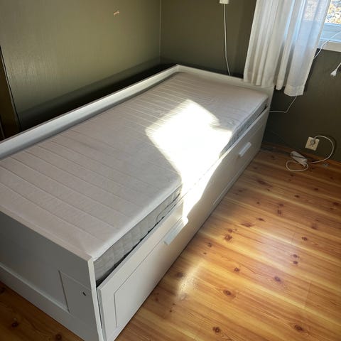 IKEA dagseng i hvit utførelse. Sengen har ribbebunn og tre uttrekksskuffer under for oppbevaring. Passer som enkeltseng eller dagseng i soverom, gjesterom eller stue. Klassisk, rett design med panelpreg i rygg- og sidegavl. Materiale i treverk/plate med malt overflate. Madrass følger med etter avtale dersom det er aktuelt.