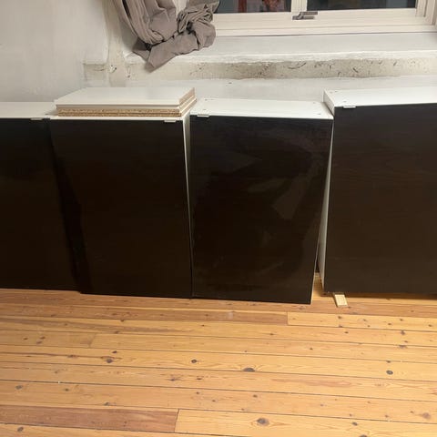 God brukte IKEA Faktum hyller gis bort. Vi har 14 skap uten dører og 2 skap med dører. Vi har også en skapstamme med ødelagt topplate for de som kan fikse.