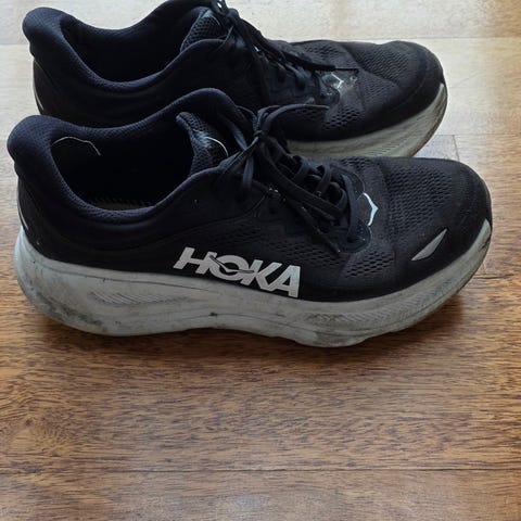 Hoka Bondi 9 løpesko i størrelse 48. Modellen er merket «M Bondi 9 Wide», som betyr at den har bred passform. Overdelen er i pustende mesh i blåtoner med kontrastdetaljer. Skoene har kraftig mellomsåle for demping og yttersåle med gummifelter for grep. Egnet som løpesko eller til annen trening og hverdagsbruk der man ønsker god støtdemping og komfort.