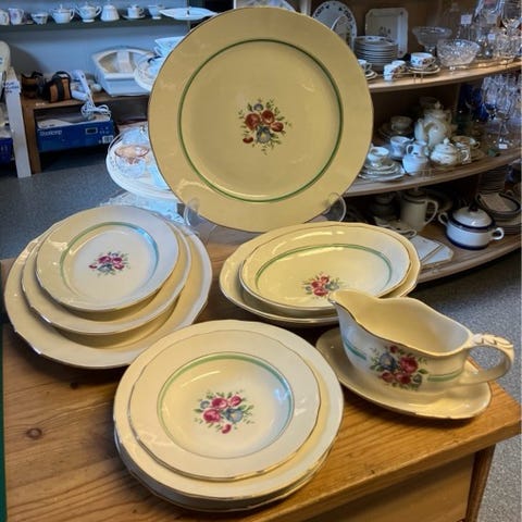 Arabia service til 12 i porselen med blomstermønster i rosa og lilla toner. Serviset har bølget kant og dekor langs kanten og i midten. Egner seg til servering av middag, kaker eller andre retter ved borddekking.