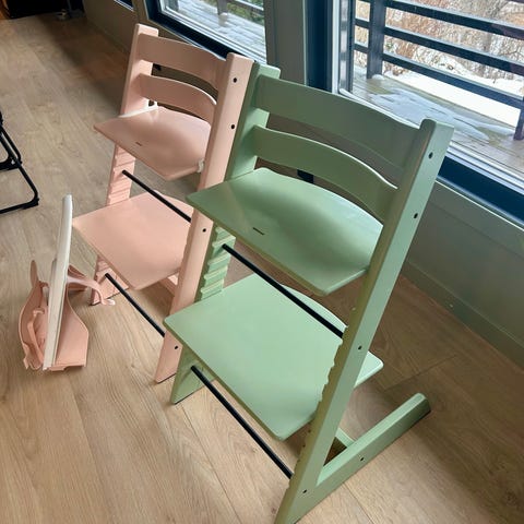 Stokke Tripp Trapp høy barnestol i svartlakkert tre. Stolen har justerbart sete og fotbrett som kan flyttes i høyden etter barnets størrelse. Klassisk trappestol-konstruksjon som gir god sitteposisjon ved bordet. Egnet som barnestol fra småbarnsalder og oppover, avhengig av tilbehør og behov. Noe slitasje på kanter og flater, se bilder for detaljert tilstand.