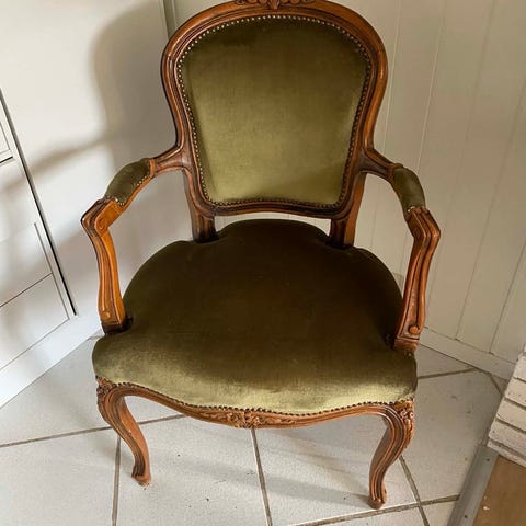 Nydelig og veldig god stol. Trekkes må renses el skiftes, ellers kjempefint tre og i god stand.