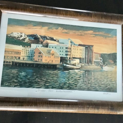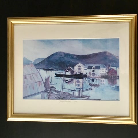 Bilde av Harstadkunstneren Eldar Larsen. Motivet er fra Harstad sentrum i gamle dager. Bildet befinner seg i Kvæfjord og kan hentes her eller kan sendes om kjøper betaler porto. Sendes kun som Norgespakke med Posten. Se gjerne også mine andre annonser ved å klikke på navnet mitt. Bruker ikke fiks ferdig.