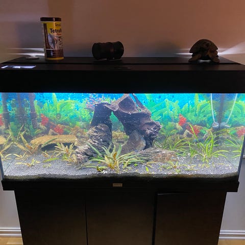Akvariet er i god stand og uten lekkasjer. Få brukmerker på glasset og på silikon.