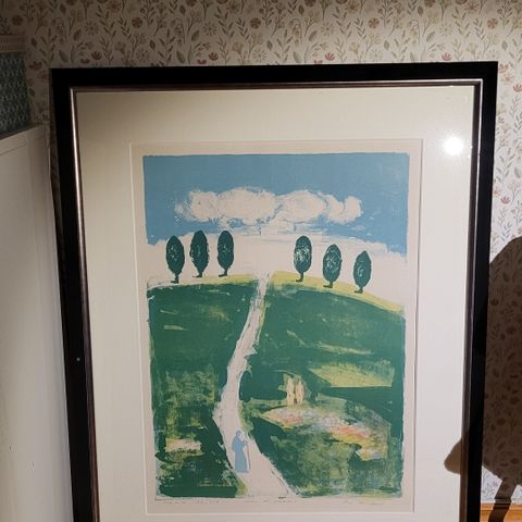 Selger bildet "Blå dal" av Kjell Nupen. Bildet er unummerert og signert. Det er noen merker på rammen, som vist på bildene.