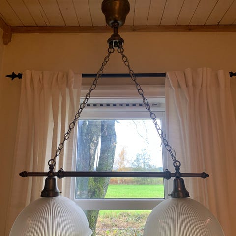 Gammel taklampe. Mangler to stk små deler øverst, se bilde nr tre. Ett hull, se bilde nr sju.