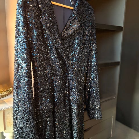 Den har omslagseffekt med v-utringning og knytebelte i livet.