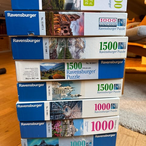 Selger 2 stk puslespill med 1000 brikker. Morsomme motiver med masse detaljer av Jan Van Haarsteren. Brannstasjon og bilverksted.