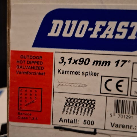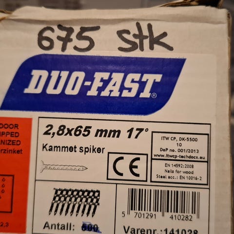Duo-Fast kammert spiker 2,8x75 mm. Spikrene er 17° og levert i remser for spikerpistol. Egnet til ulike trearbeider der kammert spiker i denne dimensjonen er påkrevd. Antall i esken er merket som 375 stk. CE-merket produkt med varenummer 141029.