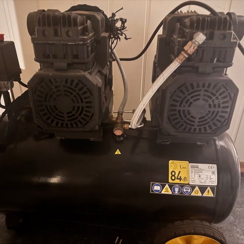 Kompressoren bygger trykk som den skal og holder trykket fint. Normal bruksslitasje etter alder, men fullt fungerende. Leveres med det som vises på bildene.