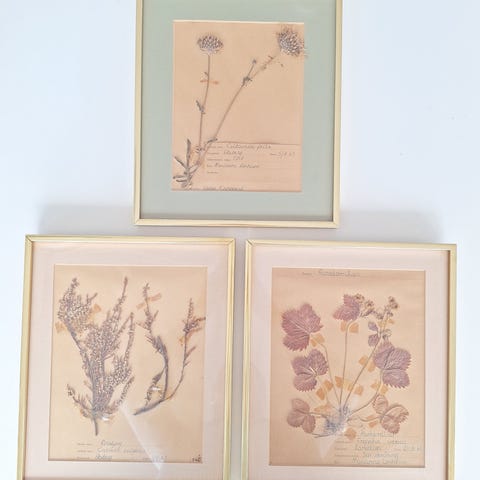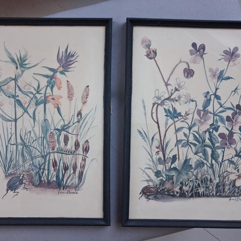 Ukjent merke botaniske plansjer veggbilder i sett med 2. Motivene viser detaljerte illustrasjoner av ulike gress- og blomsterarter på mørk bakgrunn. Hver plansje er montert som veggbilde med oppheng øverst. Egner seg som dekorasjon i for eksempel stue, kjøkken, kontor eller undervisningsrom der man ønsker et natur- og planteinspirert uttrykk.