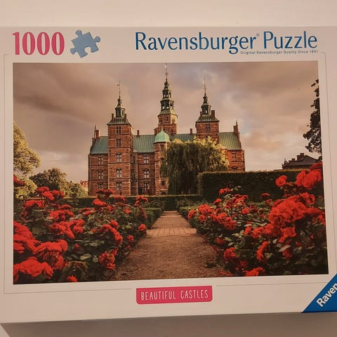 Ravensburger Beautiful Castles puslespill med motiv av et slott omgitt av hage og roser.