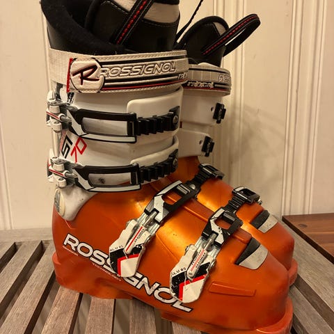 Rossignol alpinstøvler i størrelse 245 mm (sålelengde 288 mm). Støvlene har hardt ytterskall i plast og myk, polstret innerstøvel. Modellen har fire justerbare spenner i plast/metall.