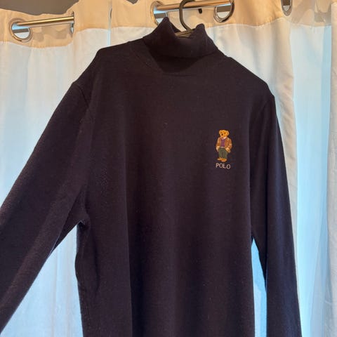 Ralph Lauren Polo genser for herre i størrelse L. Genseren er grønn og laget av fin ull. Modellen har høy hals med halv glidelås i front og ribbestrikkede kanter i hals, ermer og nederkant. Passer til hverdagsbruk og kan brukes alene eller over en skjorte eller T-skjorte.
