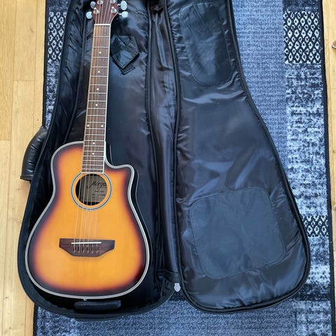 Jasmine akustisk gitar med treverk i naturfinish. Gitaren har stålstrenger, gripebrett med markeringer og gullfargede stemmeskruer. Kroppen har innebygd elektronikk for tilkobling til forsterker. Leveres i hardt etui som gir beskyttelse under lagring og transport.