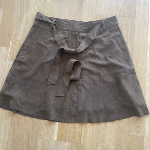 Second Female skjørt i semsket skinn for dame. Skjørtet er i størrelse M og har en beige farge. Modellen er rett og kort, med sidelommer og enkel sømdetalj i front. Materialet er semsket skinn som gir et mykt uttrykk. Passer til bruk til hverdags eller mer pyntede anledninger, kombinert med ulike topper og strømpebukser etter behov.