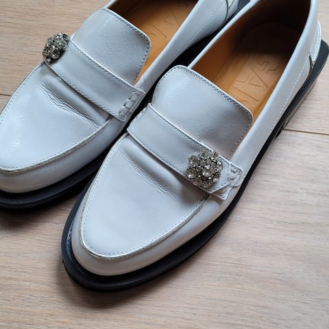 Walk London loafers i hvitt skinn i størrelse 46. Skoene har klassisk mokkasinfasong med avrundet tå og dekorativ metallspenne i gullfarge over vristen. Overdel i glatt skinn og innersåle i skinn med Walk London-logo. Yttersåle i skinn. Modellen er egnet som pen- eller hverdagssko til herre.