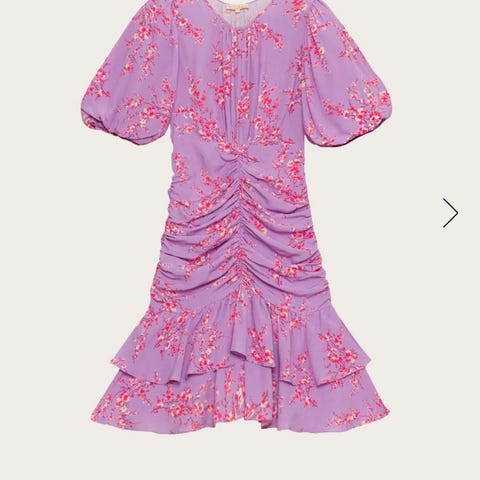 Ganni sommerkjole for dame i størrelse 38 S/M. Kort kjole i rosa bomull med voluminøse ermer og bred krage. Ermene har mansjetter med knapper. Rett, figurnær passform og kort lengde som går til over kneet. Egnet til bruk om sommeren eller ved andre anledninger der en lett bomullskjole passer.