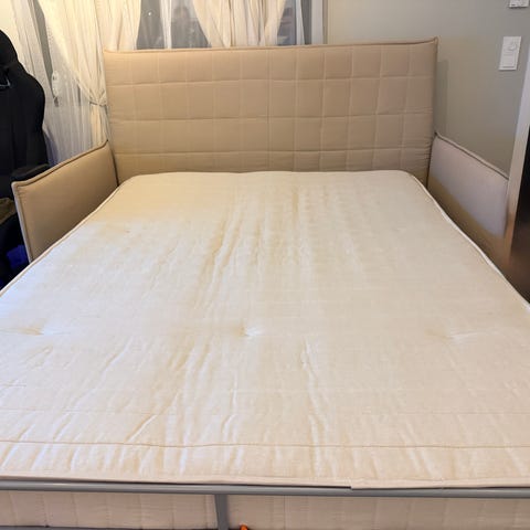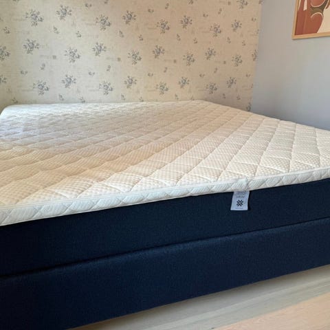 God Jensen seng. Sengen har polstret gavl med knappestikninger og rektangulær fasong. Overmadrassen ligger oppå hovedmadrassen og kan tas av. Passer som fast sengeløsning på soverom eller gjesterom.