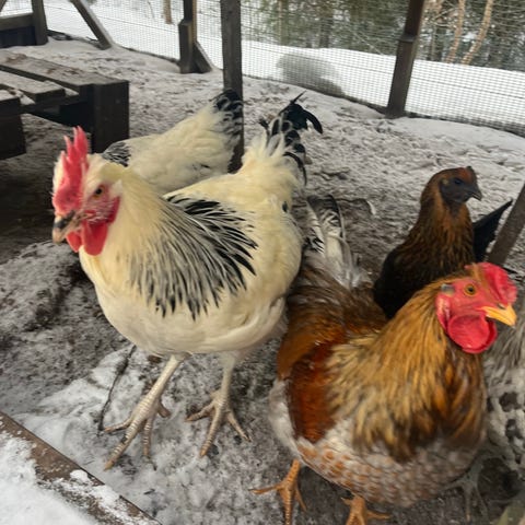 3 haner selgers til kr. 100 per stk. Flotte store haner. Kun vært foret med økologisk for. 1 hvit, 1 maran farget, og 1 som er flerfarget.