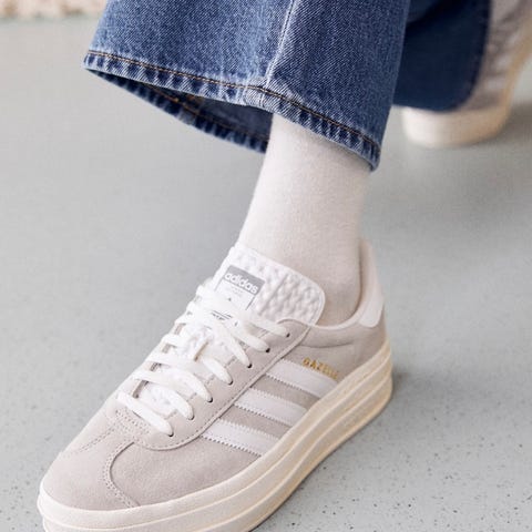 Adidas Gazelle platform sneakers i størrelse 38. Modellen har grønn overdel med hvite Adidas-striper og platåsåle med gummisåle under. Overdelen er i semsket materiale med snøring foran. Innvendig såle er merket Adidas. Egnet som fritidssko og hverdagsbruk.