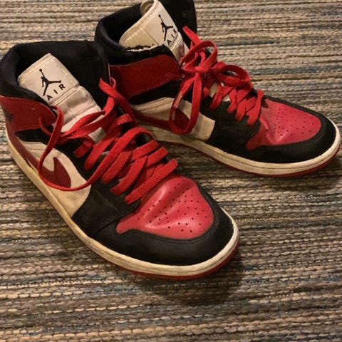 Nike sneakers joggesko i størrelse 44. Modellen er en høy/mid-cut variant med snøring. Skoene har rød og svart overdel med Nike-logo på siden og hvit yttersåle. Passer til hverdagsbruk og fritidsaktiviteter. Øvre materiale fremstår som syntetisk materiale og tekstil, med polstret ankelparti for ekstra komfort. Sålen er flat med gummisåle som gir godt grep på underlaget.
