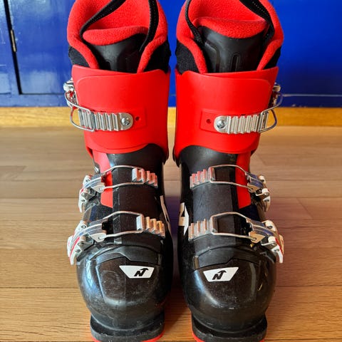 Pent brukte Nordica Speedmachine alpinstøvler i størrelse 33-34 (mondo 21-21,5). Støvlene har justerbare spenner foran for god tilpasning til foten. Modellen er beregnet for barn med vanlige alpinbindinger. Ytterskallet er i hard plast for stabilitet og støtte, mens innerskoen er polstret for komfort.