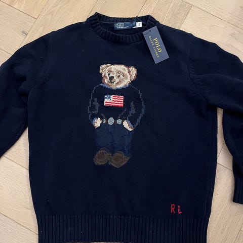 Selger min Ralph Lauren Polo Bear, fordi jeg ikke har bruk for den. Denne er en veldig god og varm genser som har en bjørn på midten av genseren. Usikker på autentisiteten, derfor selges billig.