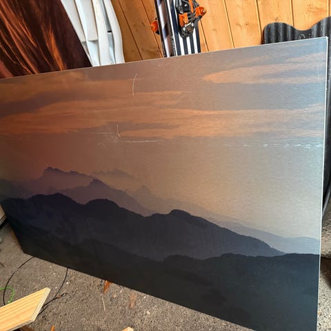 Fotokunst veggbilde med landskapsmotiv i varme og kalde toner. Bildet viser dramatiske fjellformasjoner og lyssetting som gir et naturpreg. Trykket står på en plate/lerret som egner seg til oppheng på vegg i for eksempel stue, kontor eller gang. Flerfargede nyanser med hovedvekt på brunt, oransje og blått gir et markert uttrykk i rommet.