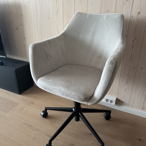 Stolen har god polstring, integrerte armlener og et stabilt understell i sort metall med hjul. Den passer perfekt sammen med både eikebord og mørkere interiør. Kan justeres opp og ned.