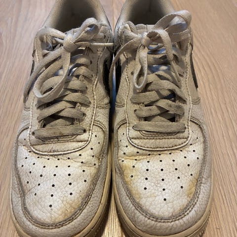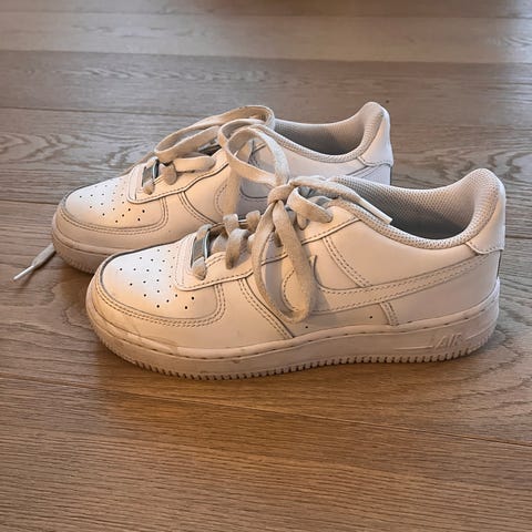 Nike sneakers joggesko i størrelse 43. Modellen er lave joggesko med snøring. Skoene er hvite med mørk blå Nike-logo og lys såle. Overdelen har perforeringer i tåpartiet for ventilasjon. Egnet som fritidssko og til hverdagsbruk.