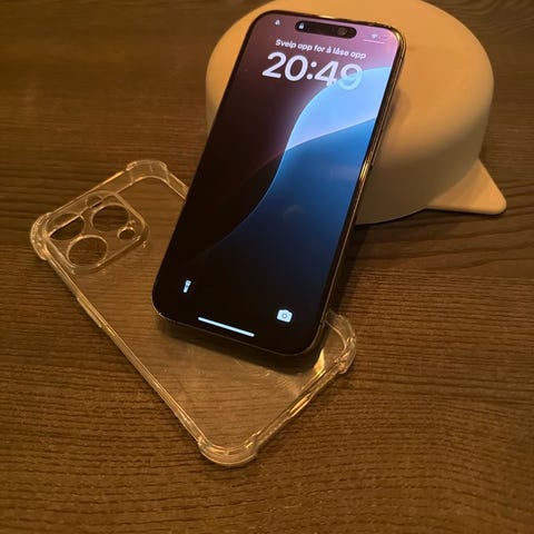 Apple iPhone 15 Pro smarttelefon med 128 GB lagringskapasitet. Modellen har trippelt kamerasystem på baksiden og frontskjerm med kamerautsnitt øverst. hvit/lys. Leveres med original eske slik den vises på bildene.