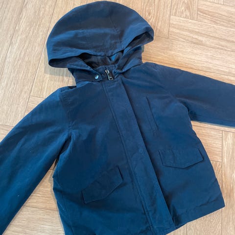Wheat jakke for gutt i størrelse 98. Jakken er blå. Den har hette, glidelås med knappestolpe, lommer foran med klaff og knapp, samt elastikk ved håndledd. Innvendig er det navnelapp og justerbar stramming nederst. Passer som ytterjakke til hverdagsbruk. Lite brukt.