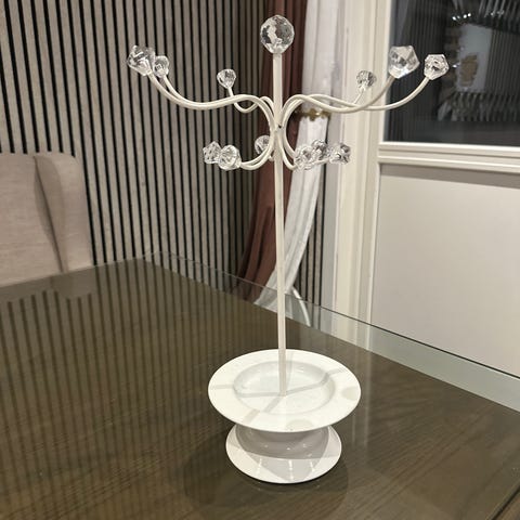 Stor smykkestativ eller dekorasjon i hvitlakkert metall. Stativet er formet som en kjole med dekorative metallbuer og detaljer, og står på en stabil fot. Egnet til oppbevaring og organisering av smykker som halskjeder, armbånd og øredobber. Passer til plassering på kommode, hylle eller sminkebord.