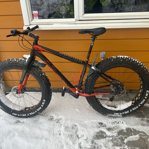 SRAM 11 speed girsystem, race face turbine krank, c4 styre og sete. Denne kommer frem over alt når man slipper ut nesten all luft, da blir den bred som bare det.